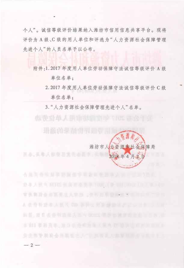經市人力資源社會保障局審核認定,山東中凱興業(yè)貿易廣場有限公司被評為“2017年度勞動保障守法誠信A級單位”,公司人力資源部張榮芳被評選為“人力資源社會保障管理先進個人”。